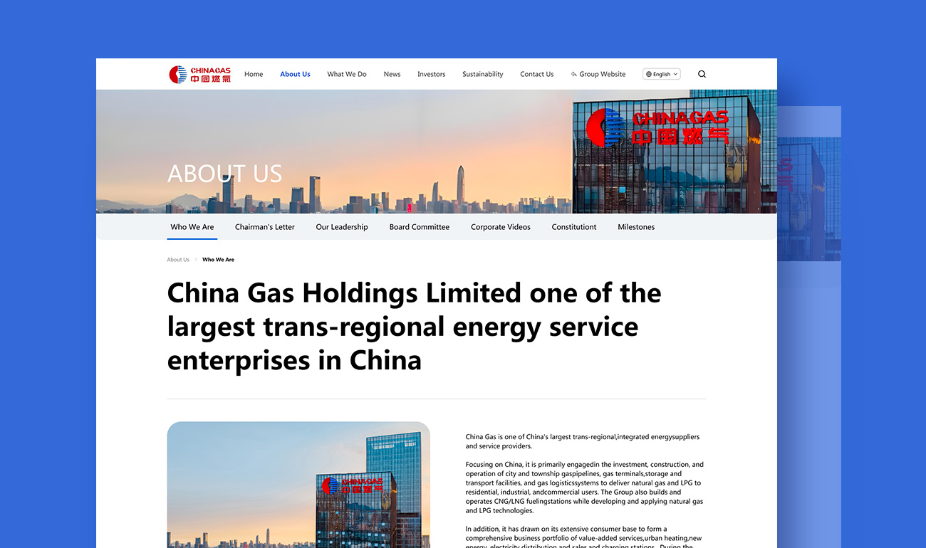 中國燃氣控股有限公司是中國最大的跨區域綜合能源供應及服務企業之一,香港聯交所主板上市企業。通過多年的發展,中國燃氣成功構建了以管道天然氣業務為主導,液化天然氣、液化石油氣、智慧能源服務、電力及新能源、新型熱采設備和技術的開發及應用、燃氣設備及廚房用具、家居生活服務、網格“店商”新零售并舉的全業態發展結構。