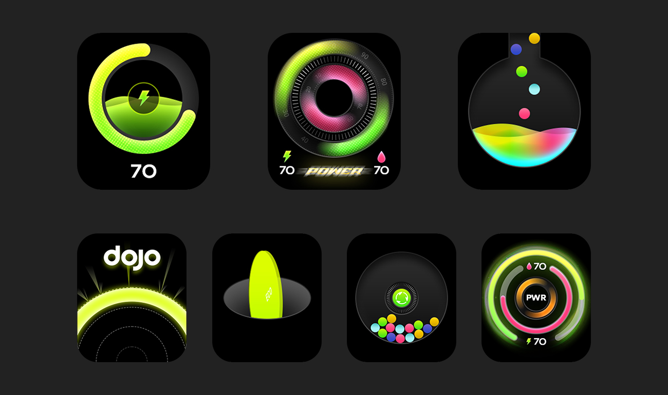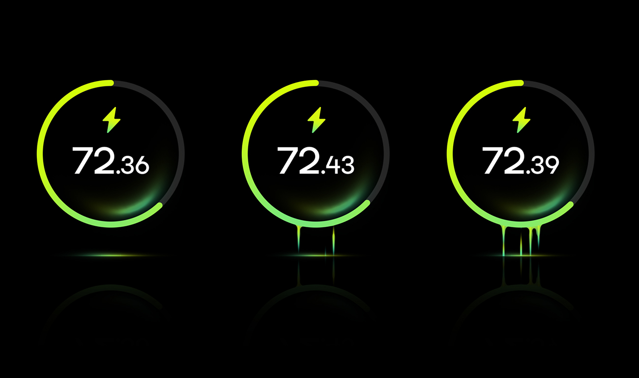 以品牌色黃綠色為基礎(chǔ),加入同色系亮色制作漸變色,作為主色,讓整體界面具備科技現(xiàn)代感。開機界面同色系泡泡相互擠壓碰撞后顯現(xiàn)出品牌logo,充電界面小泡泡自下而上匯入能量球中,能量球中有水波紋隨著電量向上攀升表達(dá)電量狀況,充電時光影炫彩明亮,外環(huán)進(jìn)度條顯示充電進(jìn)度,塑造出通透感。整體用光影互相呼應(yīng),在動態(tài)形態(tài)下交互感更強。界面采用簡潔明了的圓環(huán)表達(dá)數(shù)據(jù)信息。
