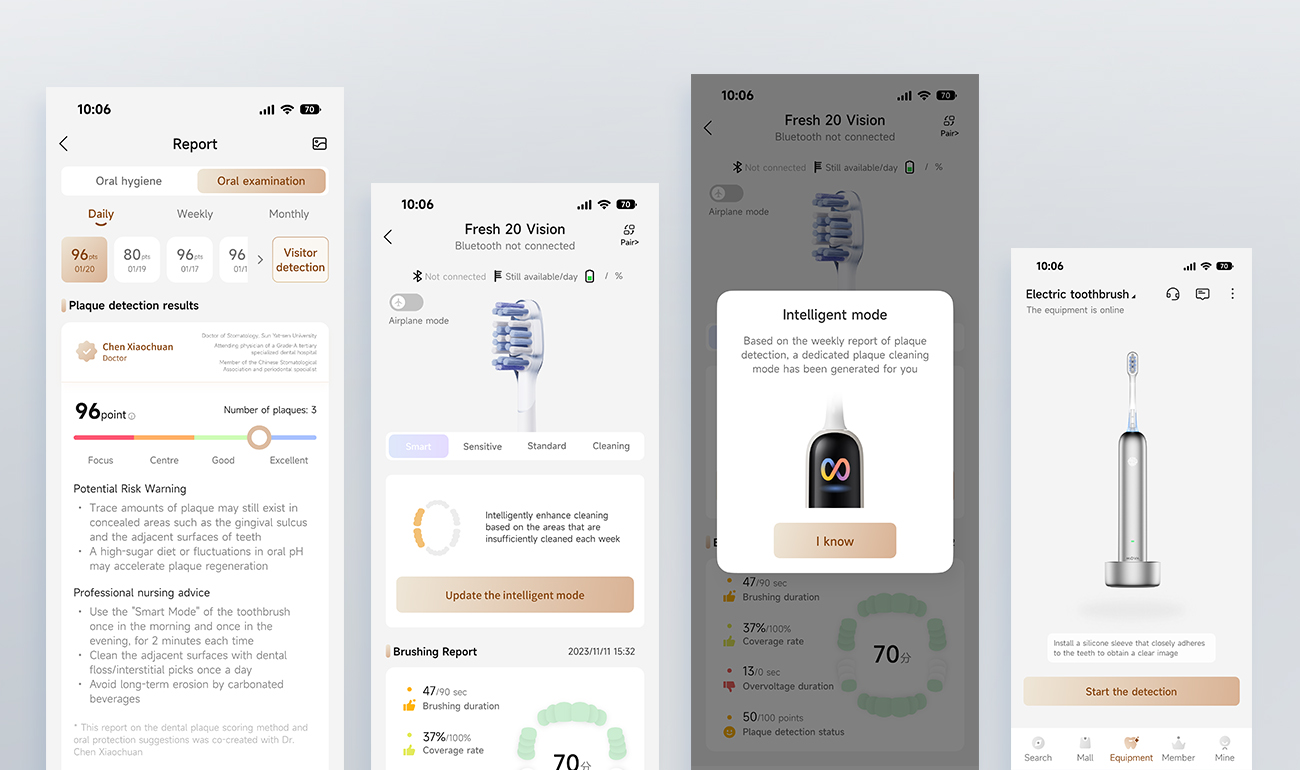 部分界面采用上下滑動的交互方式,采用同色系漸變塑造光影效果,底光向上打光照亮區域,即實用又美觀。按鈕采用相鄰色作為漸變主色,色度跨度小,不容易形成色差,適合在小屏幕上使用。同時,適當的加大界面字體,使用戶在使用牙刷時可以看的更加清晰。敏感模式放大信息區,牙齒的元素作為背景點綴出現不會喧賓奪主。界面采用同風格光線作分割線,合理分割不同信息板塊,采用柱狀圖來表達數據信息,柱狀圖采用相同漸變原理制作線性漸變,下方與背景色相互融合,讓色彩過渡更加自然和諧。整體以簡約大方為主,去除繁雜裝飾利于小屏展示,同時添加科技光線,賦予設計科技感。