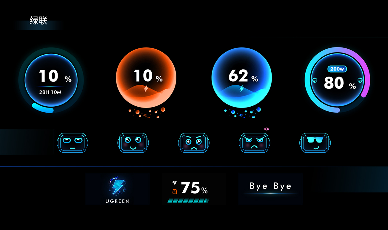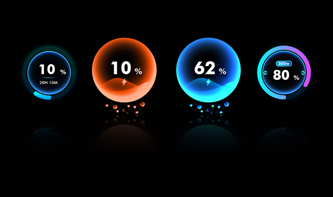 以藍色為基底,加入同色系亮藍偏青色制作漸變色,作為主色。充電界面小泡泡自下而上匯入能量球中,能量球中有水波紋隨著電量向上攀升表達電量狀況,同時,區分快充、慢充效果,快充時光影更加炫彩明亮,泡泡升起速度更快。炫彩的藍色進度條以無刻度模式展示,用不同色調塑造出氣泡通透感。標題采用微弱光影分割顯示區,添加同色系漸變線條加強分割區。