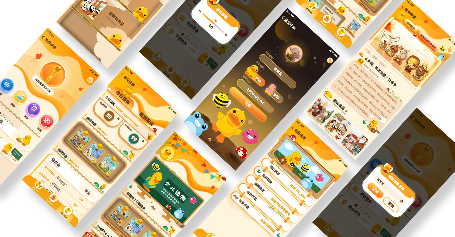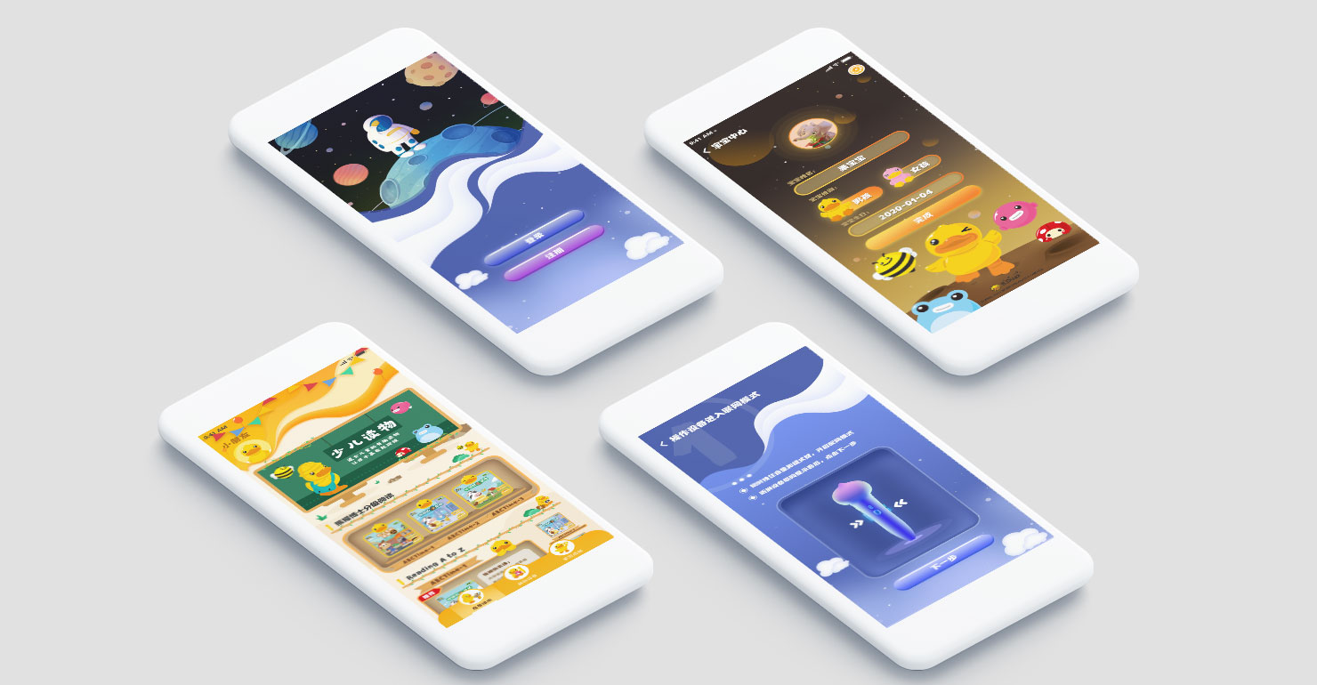 要求設(shè)計具備品牌個性的app界面,該app主要使用人群為兒童家長,設(shè)計友好交互。UI采用場景化設(shè)計,加強用戶沉浸感,使UI功能更具形象,提高用戶友好性。app端口不同各具風格,愛思星球部分以宇宙星空為主題,以藍色為主色,體現(xiàn)兒童天馬行空的想象力;B.Duck端以IP形象B.Duck為主題,搭配B.Duck家族,營造活潑快樂的氛圍。