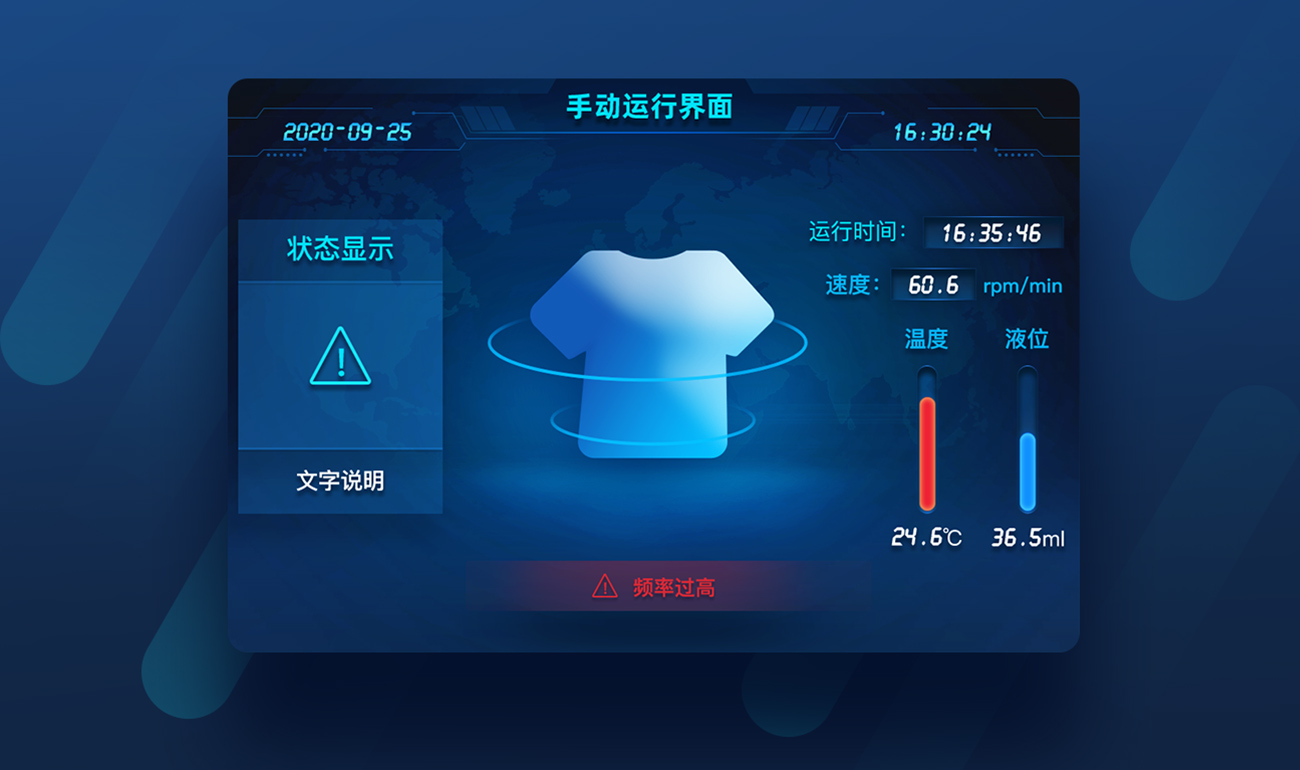 昆山工業洗衣機顯示屏與實體按鍵為一體,讓操作人員能夠更加直觀的將實體鍵與功能界面相連接,但會使屏幕占比較小,考慮到界面的可觀性,適當的調整界面字體大小和界面元素比例。同時要保證界面美觀,在此項目中采用科技風設計,用科技線條構建標題背景,讓文字在放大的同時不會讓人感覺呆板。主體背景融合全球化概念營造品牌調性,半透明質感作為文本底使文字更加突出,方便相關操作人員查看選擇。