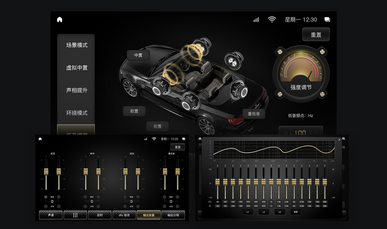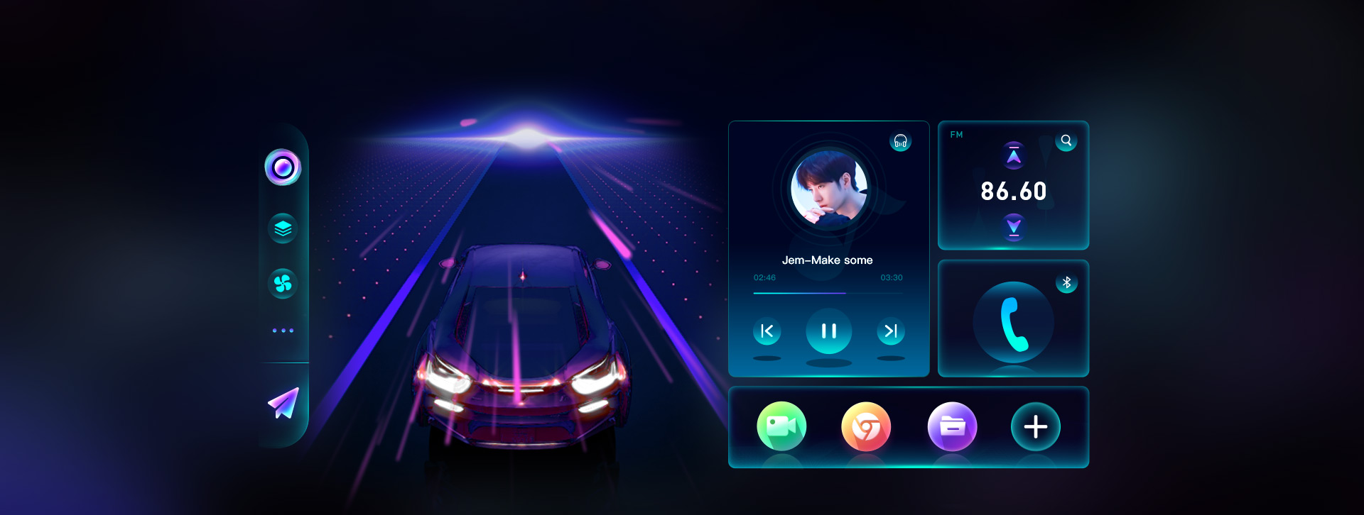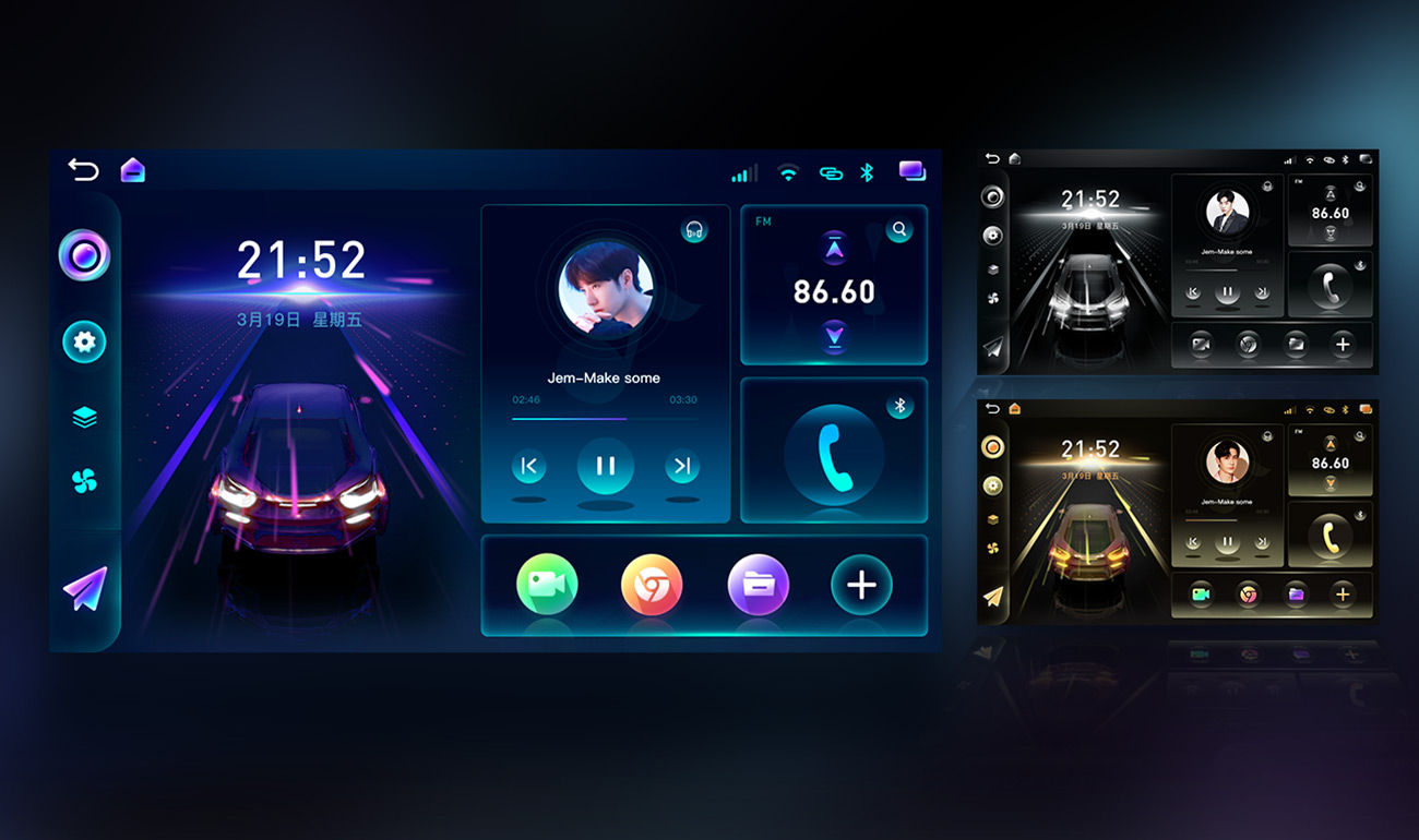 作為適應(yīng)大眾、包容性極強的車載系統(tǒng),UI搭配三色風(fēng)格選擇。用戶可以自主選擇絢麗多彩、迸發(fā)青春氣息的炫彩色,也可以選擇商務(wù)、簡潔的沉穩(wěn)黑,亦或是選擇奢侈、高貴的奢華金。界面結(jié)合用戶需求,加入動感元素,營造界面靈動感,流線化設(shè)計與汽車流暢形態(tài)相呼應(yīng),構(gòu)建車、車載系統(tǒng)兩者間的和諧關(guān)系。