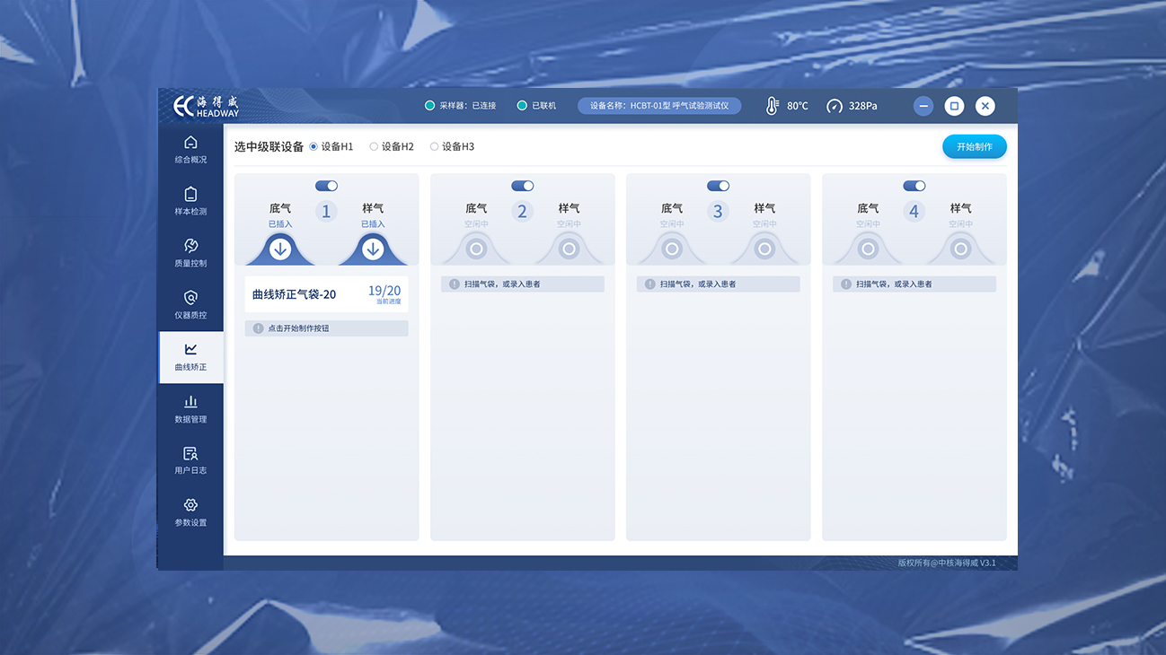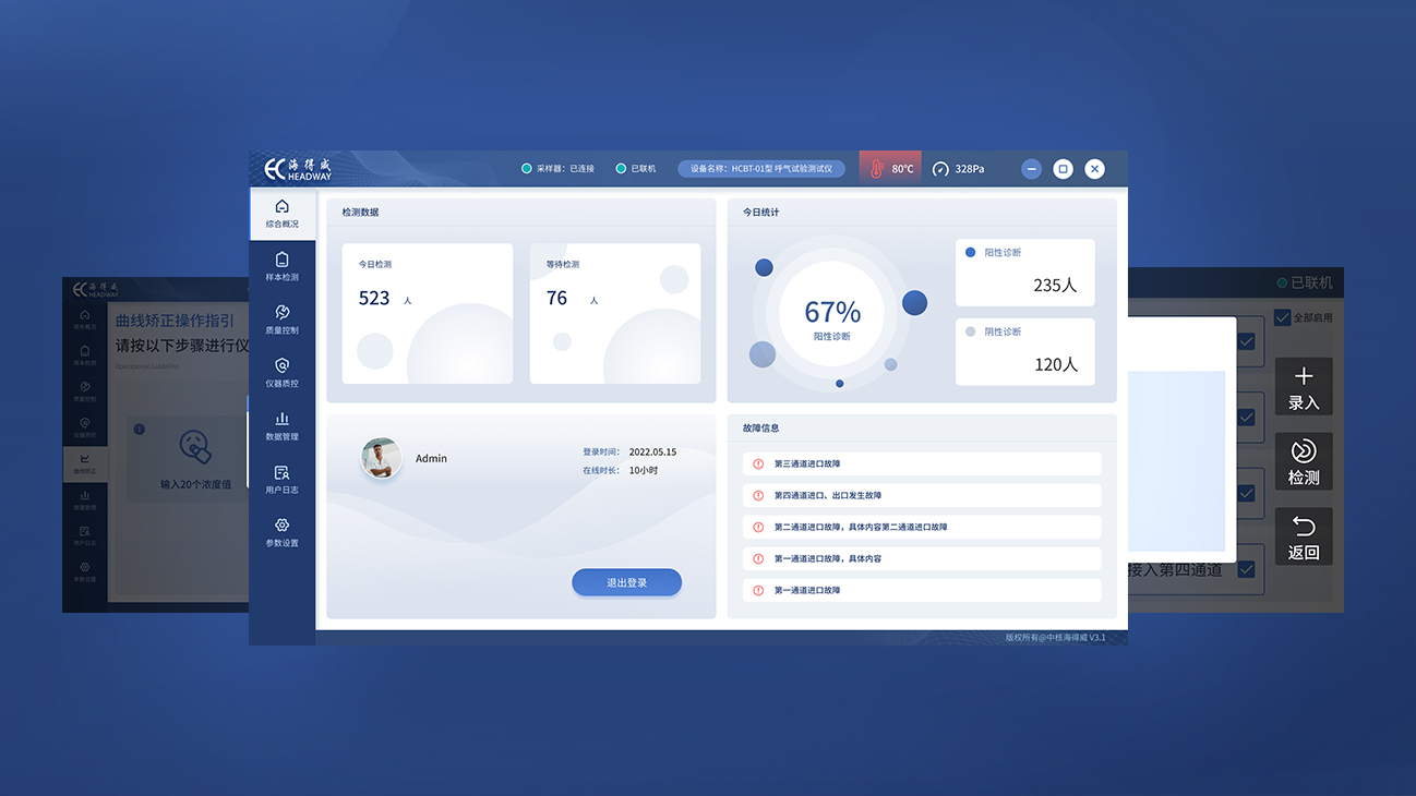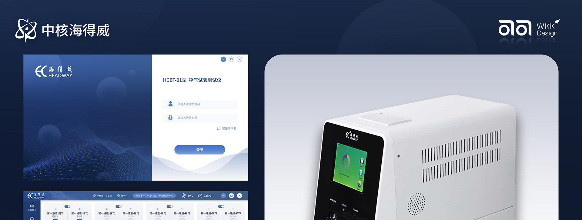 唯可可用研團(tuán)隊(duì)和中核海得威團(tuán)隊(duì)對(duì)目標(biāo)人群的用戶調(diào)研訪談和競(jìng)品分析,用藍(lán)色作為底色塑造現(xiàn)代科技感。 將UI界面與呼吸機(jī)緊密結(jié)合,比如,在界面內(nèi)添加圓形、球體,制作氣體動(dòng)效;用界面的明暗關(guān)系制作立體效果,使畫面更加通透有質(zhì)感。