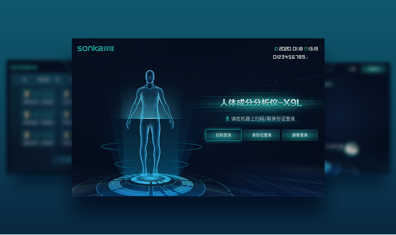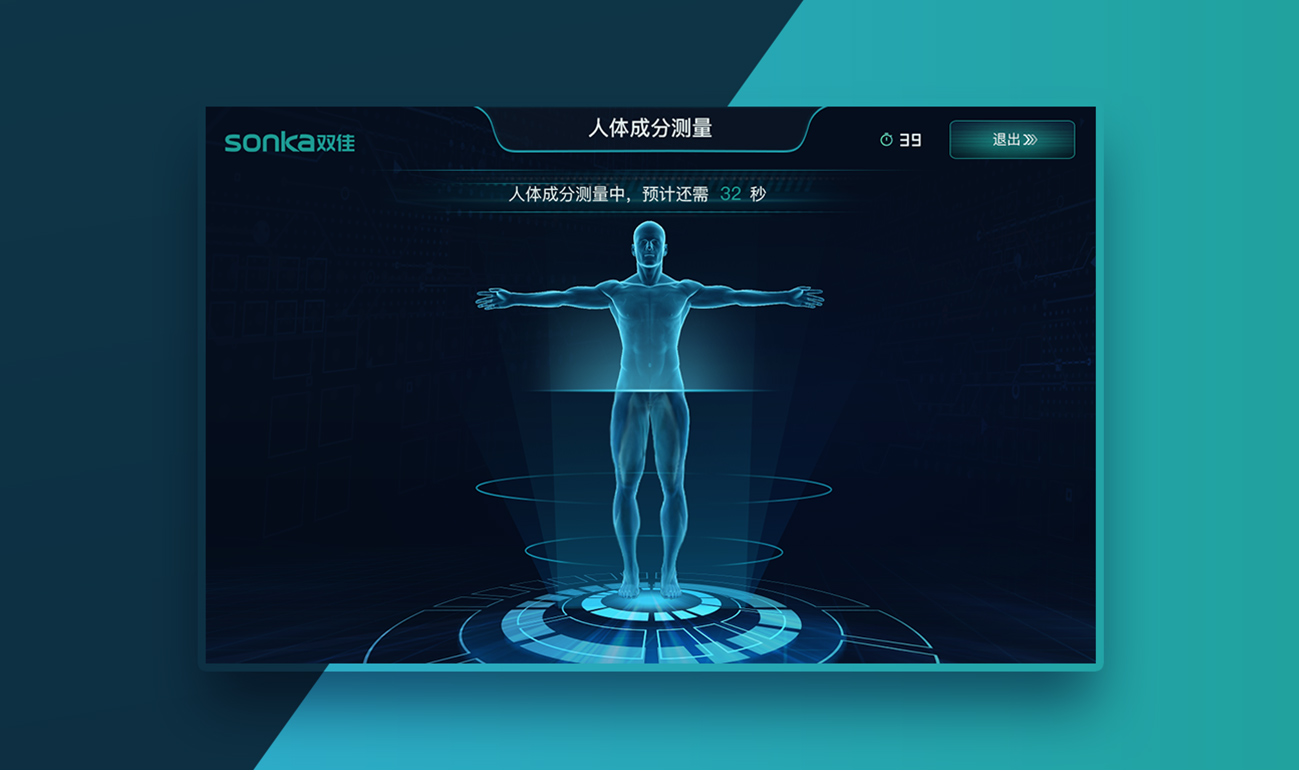 整體風(fēng)格以科技感為主,界面結(jié)合logo色,奠定整個項(xiàng)目的界面風(fēng)格。與logo相互呼應(yīng),讓界面更加統(tǒng)一和諧。同時,利用激光線條營造現(xiàn)代科技感,用線條構(gòu)建透視,增強(qiáng)界面空間感,讓界面得到延伸,界面中添加多種激光效果,貼合人體成分分析儀產(chǎn)品特性,模仿激光掃描效果。